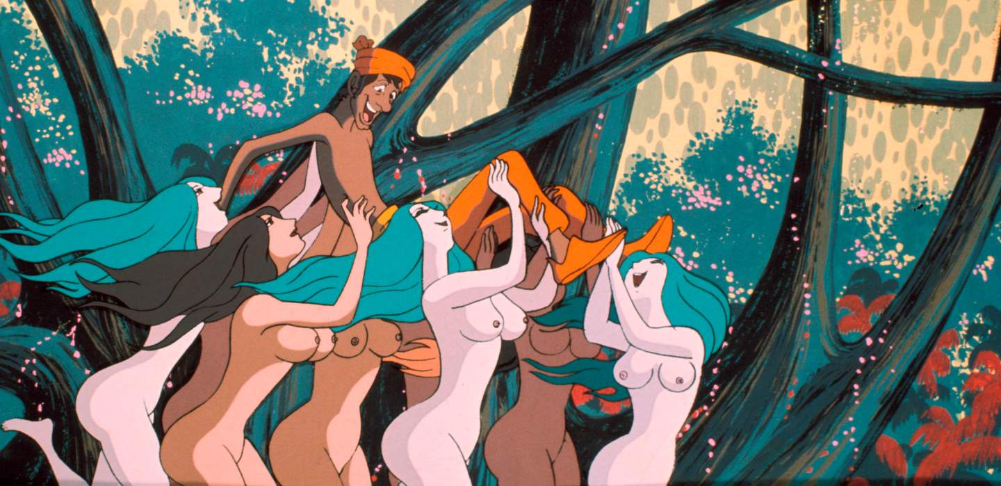 Milliam, and later Jallis – the daughter of Aldin and Milliam raised by their worst enemy, Badli (Hiroshi Akutagawa), fight for the right to decide their own romantic destiny. Like Madlia (Sachiko Ito), the feisty bandit’s daughter, they resist the social codes of their era in which women are merely prizes divided among men and actively attempt to free themselves through love only to find defeat and despair. Yet love, or more precisely lust, can also be a force of constraint and or ruin as Aldin discovers on a paradise island when he unwisely decides to abandon Madlia, who has also fallen in love with him, for the empty pleasures of orgiastic sex with the voracious islanders whose unrestrained desire soon threatens to consume him whole.