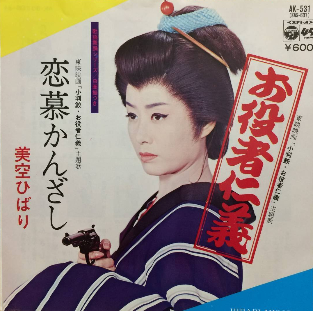 actress vs greedy sharks soundtrack albumA studio director at Toei, Tadashi Sawashima is best remembered for his work in the studio’s ninkyo eiga genre – prewar tales of noble gangsters, and samurai movies but he also made the occasional foray into the world of musical drama, teaming up with top name singing star Hibari Misora on a few of her historical action musicals. In 1966’s Actress vs. Greedy Sharks (小判鮫 お役者仁義, Kobanzame Oyakusha Jingi) Hibari once again plays a dual role though this time her casting is entirely arbitrary and the visual similarity of the legit actress and the acrobatic outlaw is never explicitly remarked upon.