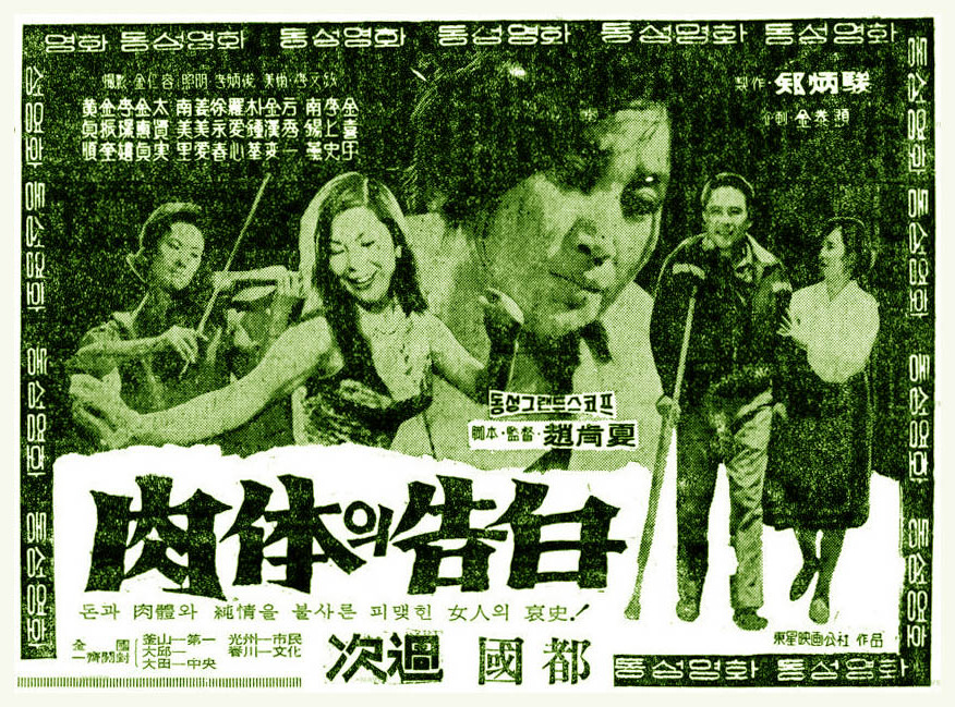 Body Confession posterThe Korea of 1964 was one beginning to look forwards towards a new global future rather than back towards the turbulent colonial past, but the rapid leap forward into a new society had perhaps left an entire generation behind as they prepared to watch their children reject everything they’d strived for in search of “modernity”. 1964’s The Body Confession (肉体의 告白 / 육체의 고백, Yukche-ui Gobak) is the story of one such woman. Widowed young, she turned to sex work in order to support her three daughters in the hope that sending them to university would win them wealthy husbands only for her daughters to encounter the very problems she worked so hard for them to avoid.