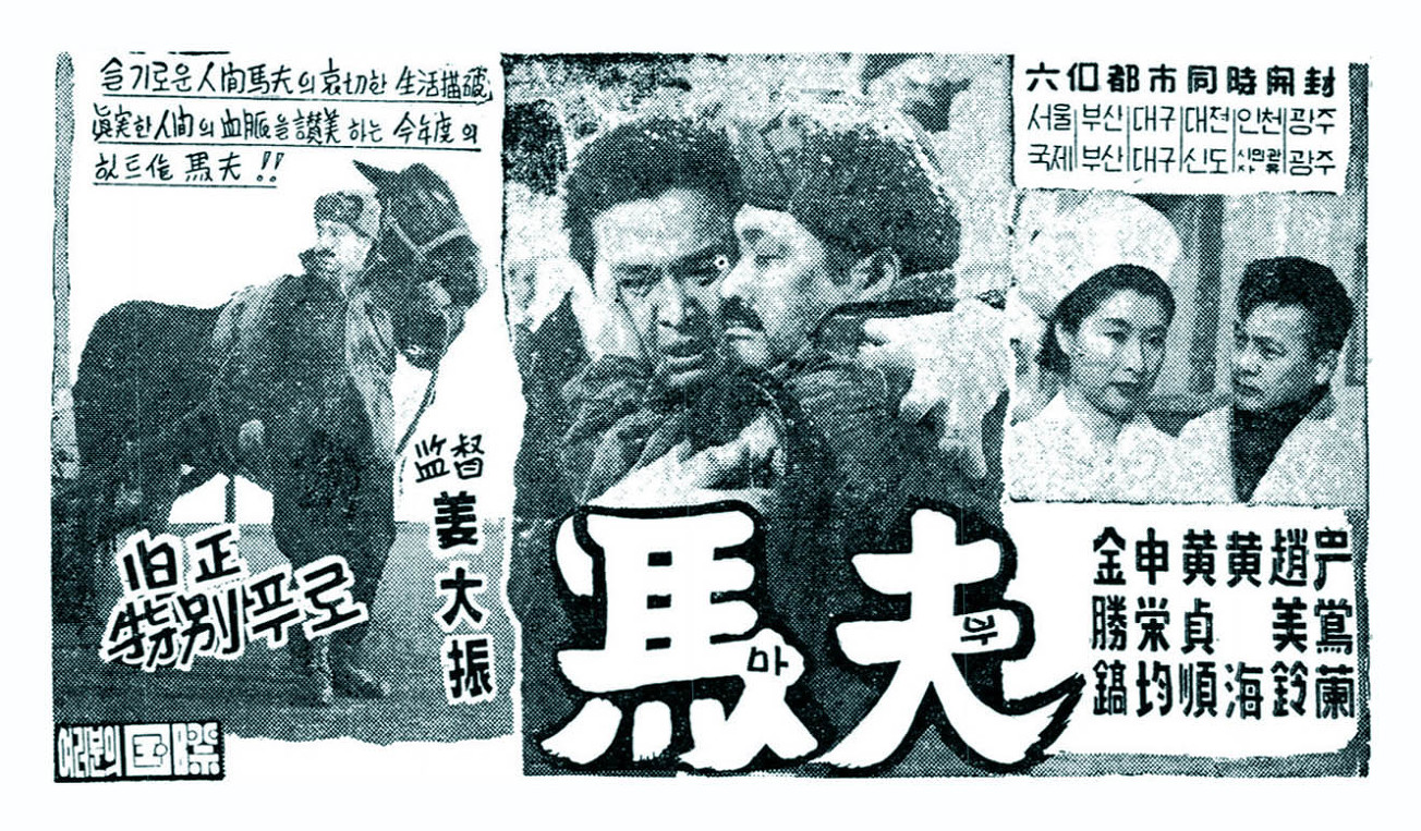 A coachman poster 1The Korea of 1961 was one of societal flux, mired in post-war poverty but striving towards a brighter economic future. The rising tides of affluence had given birth to a new middle-class with the old feudal attitudes while others were largely left behind on the shores of prosperity. Kang Dae-jin’s A Coachman (馬夫 /마부, Mabu), the first Korean film to win a major international award with the Silver Bear Extraordinary Jury Prize at the 1961 Berlin Film Festival, finds itself at just this juncture as an old man pulling a horse and cart is forced to face up the automobile age while worrying what is to become of his family in the perilous modern society.