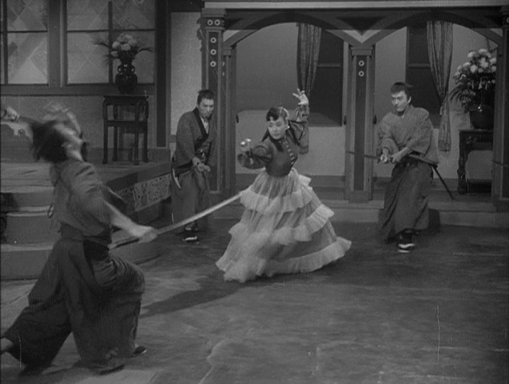 As in many of her films, Misora plays on gender ambiguity. Rejecting the cosseted life of a lady, she takes to the streets and then takes charge. She’s technically Gorohachi’s subordinate, but in reality he follows her lead, and she gives as good as she gets in the frequent fight sequences. In the end, however, she’s “rescued” by a masked samurai dressed in white with whom she becomes instantly smitten. She dreams of meeting him in a deserted field where he mildly berates her for her lack of femininity, insisting that he liked “the Oshichi from before”, meanwhile she conjures up the figure of Kawashima who manfully wades in to save her. Previously, in refusing to help, Kawashima had told her that “a woman should know her place and act like a woman”. Oshichi tells him perhaps he should act like a man, practice kendo or something else more manly rather than prancing about learning to dance. His words have perhaps cut her because he tells her the same thing in her dream, insisting that he “could fall for the womanly Oshichi”.