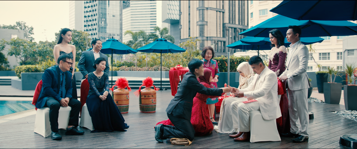 Cheerfully narrated by Edwin’s upbeat dad Mr. Tan (Vincent Tee), this is a story which begins with a wedding and so we know right away that it all works out and Sarah and Edwin will get their happy ending, yet there are a lot of obstacles standing in the way of their burgeoning love story not least a lack of understanding that begins with Edwin somewhat insensitively advising Sarah to remove her headscarf to make a better impression in the videos. Ill-advised by Imran, Edwin is wary of telling Sarah about his family’s occupation firstly in case it causes offence and then later uncertain what level of interaction is permitted between them considering he’s been handling pork. Sarah’s cheeky brother Yusri (Benjamin Zainal) jokes that her potential love interest is not “halal”, but then her parents aren’t quite as against the idea as she might have assumed them to be while she finds herself somewhat conflicted, not least in her ambiguous relationship with the superficially “perfect” Imran whose cheesy pick up lines and tendency to try far too hard perhaps convince her that he might in fact be too perfect or at least the wrong kind of perfect for her.