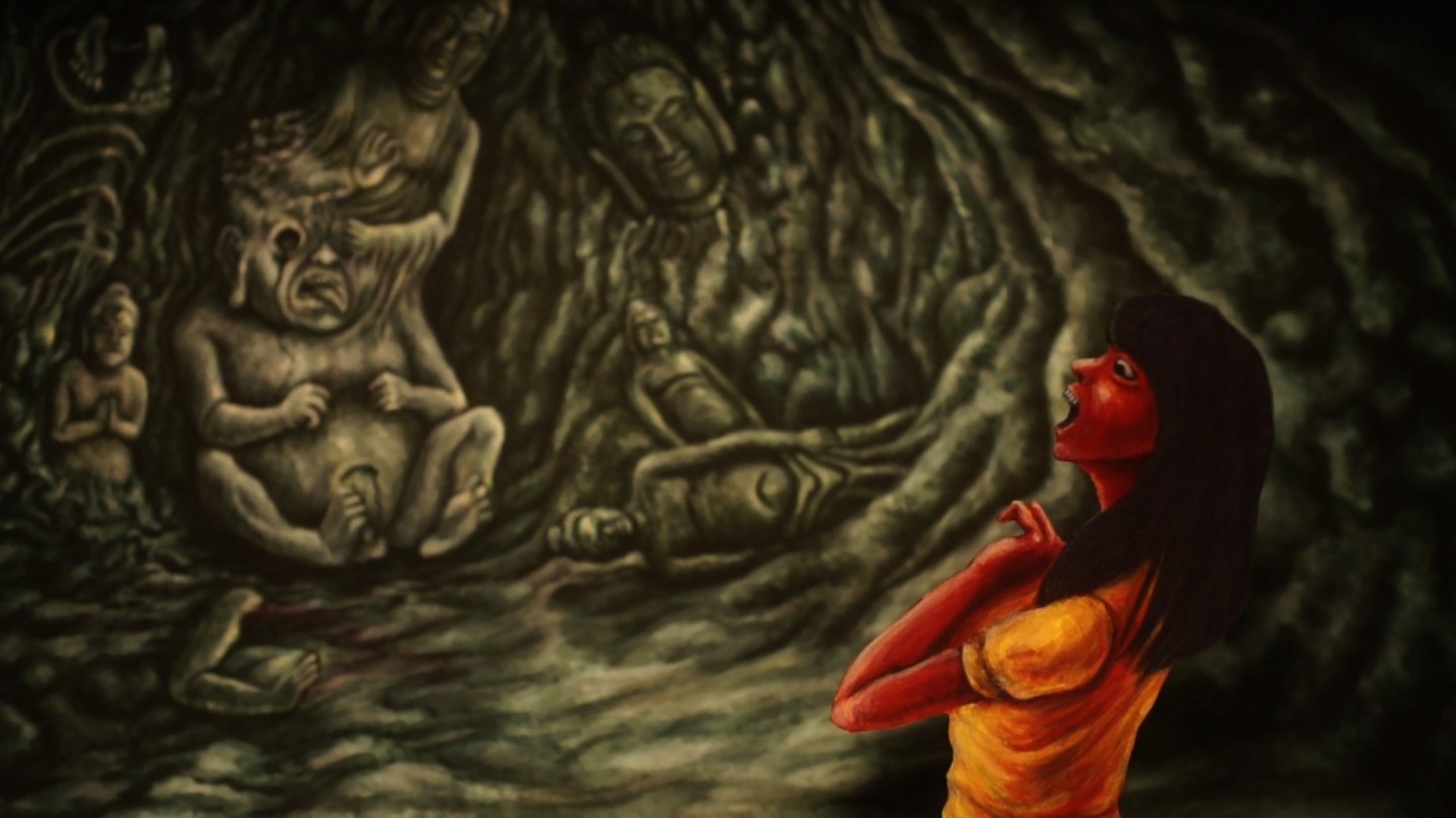 As showcased in the live action intro/extro sequences in which the young woman painstakingly assembles and then disassembles her world, pausing briefly to look admiringly at a figure perhaps representing herself before handing it back to her gloved butler for safekeeping, Burning Buddha Man’s aesthetics consist of a series of beautifully painted backdrops and paper cut out puppets of its strange cast of characters which include a gang of Giger-esque biomechanical former Buddhist monks rendered monstrous by their experiments in spiritual enhancement. Amping up the body horror quotient, real liquid often oozes from their mouths made sickening in its viscosity while blood later fills the screen. Yet for all that there’s a strangely childlike glee in the macabre grimness as the wholesome heroine and her pure-hearted friends push back against the corruptions of hyper-religiosity and spiritual madness hoping to restore rather than destroy but ultimately finding themselves forging a purifying hellscape that ends only in fire (and a peculiar kind of sludge making its way towards the drain of all humanity). Deeply strange yet strangely charming Ujicha’s Buddhist body horror conspiracy thriller is undeniably dark but also imbued with a sense of ironic playfulness in its truly bizarre cosmology.