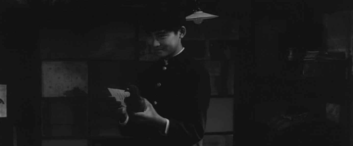 These differences in standing are also brought out in the youthful idealism of Kyoko who wholeheartedly believes she can help Masao by giving him money and then trying to improve his circumstances by getting him a job in her father’s factory. Both her father and her brother dismiss her altruistic desire to help as childish, Yuji pointing out that there are millions of poor people not just one and you can’t help them all, while their cynicism is eventually validated in the exposure of Masao’s “fraud” which accidentally brands those living in difficult economic circumstances as duplicitous criminals even as it directly implies that it is an unfair society which turns honest boys like Masao who never lie and just want to take care of their mothers into “heartless” bird traffickers. You can see why Shochiku didn’t like it, the hope of the post-war era shot down by the gun of a conflicted industrialist.