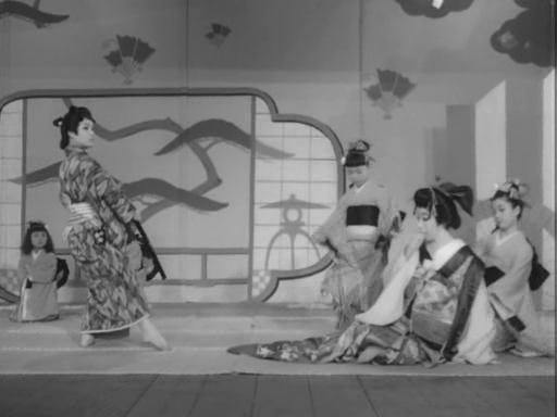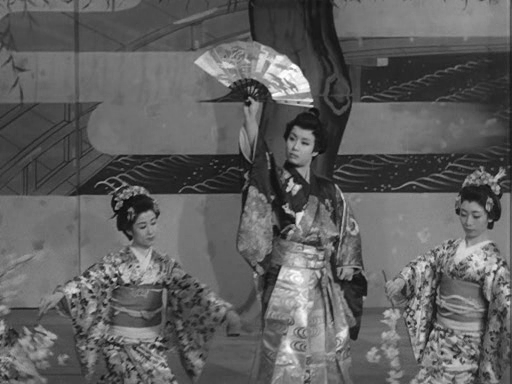 The drama starts when young actress Koharu (Hibari Misora) misplaces her fan and is lent one by another performer which attracts the attention of bad samurai Shuzen Ogaki (Kyu Sazanaka) who recognises it as having once belonged to the Shogun. As it turns out, Koharu’s friend Hanji (Rentaro Kita) was gifted the fan by a childhood friend, a noble woman, Okyo (Keiko Yashioji), for whom he may have had feelings which would could never be returned seeing as he was the son of a maid. Having seen him in a play but feeling it would be inappropriate to meet, Okyo sent the fan in fondness but had not realised it to be valuable and is now in a difficult position as the Shogun will soon be visiting and if he does not see the fan will be offended. Shuzen wants the fan for himself to embarrass Okyo and her husband and advance his own position. Just as Okyo dispatches trusted retainer Gennojo (Chiyonosuke Azuma) to ask Hanji to return the fan, Shuzen sends in his goons killing Hanji but only after he manages to substitute a fake fan for the real one.