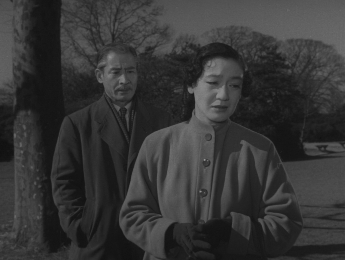 By contrast, we get the impression that Fusako, who has two children already, will likely return to her husband. Shuichi has the talk with his brother-in-law his mother hoped he would, but bonds with him in male solidarity, excusing his affair while advancing that Fusako doesn’t understand that he is merely working hard for their family laying bare a fundamental disconnect in the thinking of men and women further borne out by Yasuko’s assertion that men and women deal with sorrow differently. It’s this series of disconnects, between men and women, parents and children, that Shingo is beginning to bridge only to be confronted with his own patriarchal failures. While he and his wife are seemingly happy enough, he brushing off her self-deprecating remark that he was “unlucky” in marrying her only because her prettier sister died, his children’s marriages have each failed. His failure stands in for that of his generation, realising that he all he can do for them now is set them free. Meeting Kikuko in a park with wide open vistas, oddly like the final meeting of doomed lovers aware they must now part, Shingo vows retreat, planning to retire and move to the country with his wife as if liberating the youth of Japan from the oppressive social codes of the past in ceding the “open prospects” of the post-war society to his surrogate daughter in order that she might at least seize her freedom to chase her own happiness.