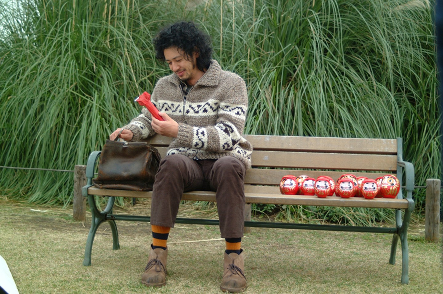 That Fumiya (Joe Odagiri) is aimless might be assumed from his unruly hair and the fact that he thinks tricolour toothpaste might be enough to jolt him out of his sense of despair but is confirmed by his matter of fact statement that he’s in his eighth year of university where nominally at least he’s studying law. His problem is that he’s amassed massive debts to a loanshark, Fukuhara (Tomokazu Miura), who breaks into his apartment and threatens him by shoving a sock in his mouth before leaving with his ID and driving licence. Fukuhara, however, later decides to make him another offer that he will cancel the debt and even give Fumiya even more money if only he will agree to wander around Tokyo with him for an unspecified time until they reach Kasumigaseki where he intends to hand himself in at police headquarters claiming to have recently murdered his wife.