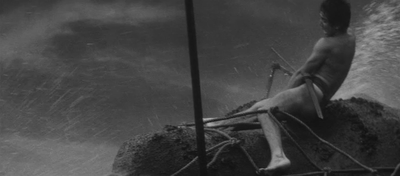Tanaka opens with a brief prologue in which an elderly man is killed attempting to destroy the “Whale God” only for his son to swear vengeance before being killed himself. The man’s mother instructs his sons to vow revenge, 10 years passing before she sends the oldest one out against the whale. He is also killed, instantly. The last of his line, young Shaki (Kojiro Hongo) is burdened with this piece of filial responsibility, forced to bear the weight of his family’s vengeance while the village elder (Takashi Shimura), a samurai, wants to ensure the Whale God’s destruction and offers up his own daughter, Toyo (Kyoko Enami), along with his lands and title to any who can bring him the snout of the whale. Shaki throws himself forward though he has little desire for the prize obsessed only with vengeance, while another challenger soon appears, Kishu (Shintaro Katsu), a uncouth drifter deciding to hang around after confirming that the offer is open to all no matter their origins.