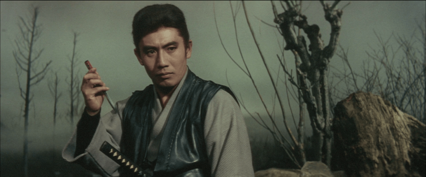 But in other ways, this is already a post-apocalyptic hellscape as Ibuki discovers on spotting a pair of crows feeding on a corpse in a river. Perhaps taking pity on one less fortunate than himself, he throws one of his darts and skewers them. Ibuki’s knife supply seems to be inexhaustible, and he never appears to go back and retrieve the ones he’s thrown though his skill does seem to lend him an almost supernatural quality. In any case, Tanaka injects a degree of weird humour in the strange town with its eccentric residents including ronin Masa who looks permanently evil yet has a strange love of dolls, while the fight scenes themselves are often somewhat comical as the gangs seem to clash like a pair of cats slapping each other. There’s even something quite funny about the way the film bluntly drops exposition at unexpected moments even in the midst of the farcical scheming between the gangsters and Ibuki running back and forth to stoke the fires of conflict. This land is so bleak, it seems to say, all you can do is laugh or you’ll end up face down in a river with crows picking at your back too, so you might as well ride off into the sunset like Ibuki looking for the next corrupt town to purify and onward towards the bounty on the horizon.