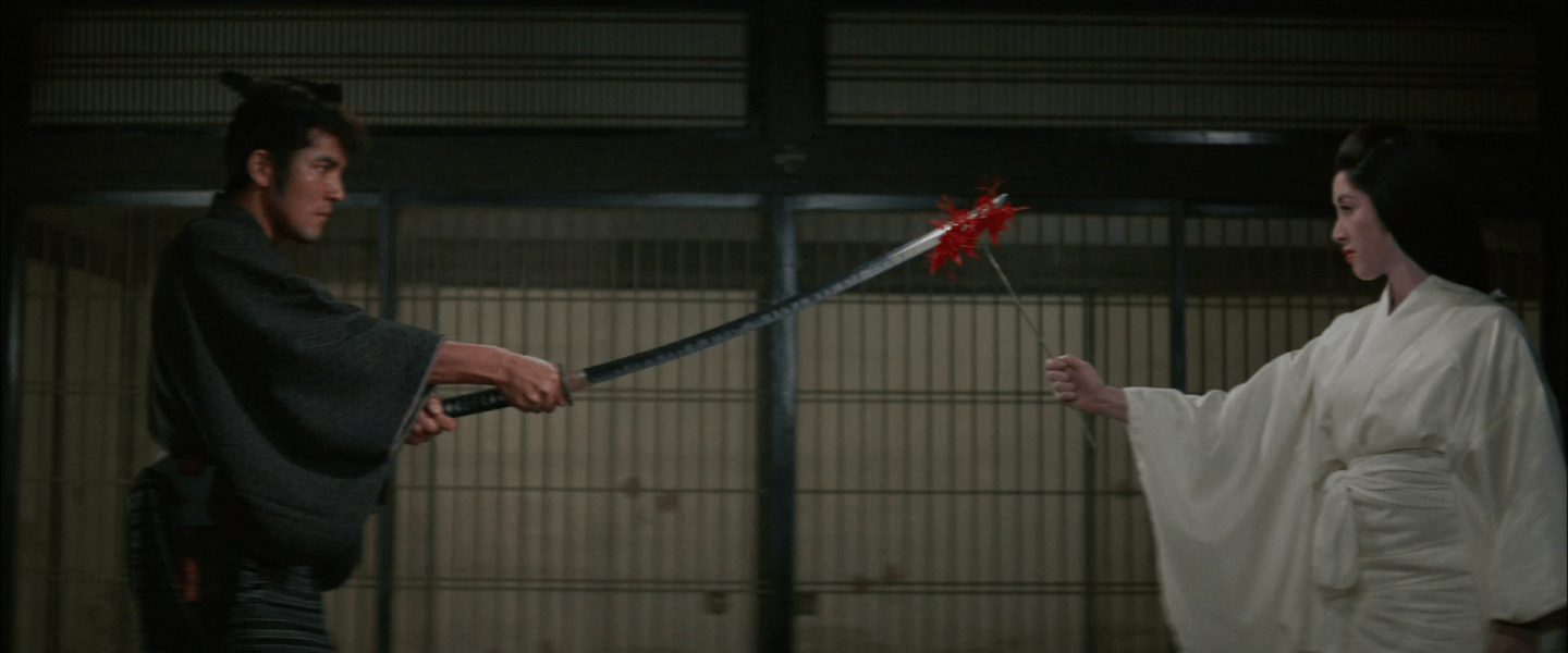 In this, Suzuki brings some of his trademark romanticism particularly in the colourful art nouveau aesthetics and frequent use of rose imagery. Though the film is clearly designed to lean into the erotic with frequent use of nudity and salacious scenes including a brief moment of lesbian seduction, it eventually heads towards romantic tragedy in which the debauched and nihilistic Toma and the wronged Kageroi discover a love made impossible by their ninja code and the times in which they live. Having been ordered to kill her, Toma declares that he will marry Kageroi in the next life and returns to her the Buddhist Manji that is the “ninja mark” of the title.