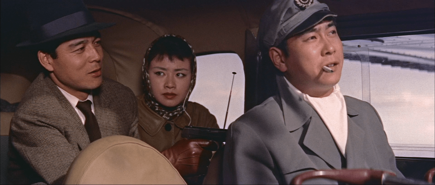 You can tell that Itagaki is not the sympathetic kind of gangster right away when he mows down a little girl while fleeing the scene, her little yellow balloon sadly flying off into the distance. His indifference to the girl’s death is ironic considering the rest of the film revolves around the struggle to save the life of a little boy, directly contrasting his callousness with the righteousness of the pilot, Ishida (Yujiro Ishihara), who is prepared to risk his own life to deliver the serum. Ishida hadn’t previously volunteered for the job because he was supposed to be going on a Christmas Eve date with stewardess Keiko (Shinako Mine), only she tells him she has to cancel because her father is on a surprise trip to town. Unbeknownst to him, however, she’s actually blown him off to go to a Christmas market with another man. In any case, with nothing else to do he accepted the job even though it involves going in a Cessna because of a malfunction on their regular plane that will take too long to repair.