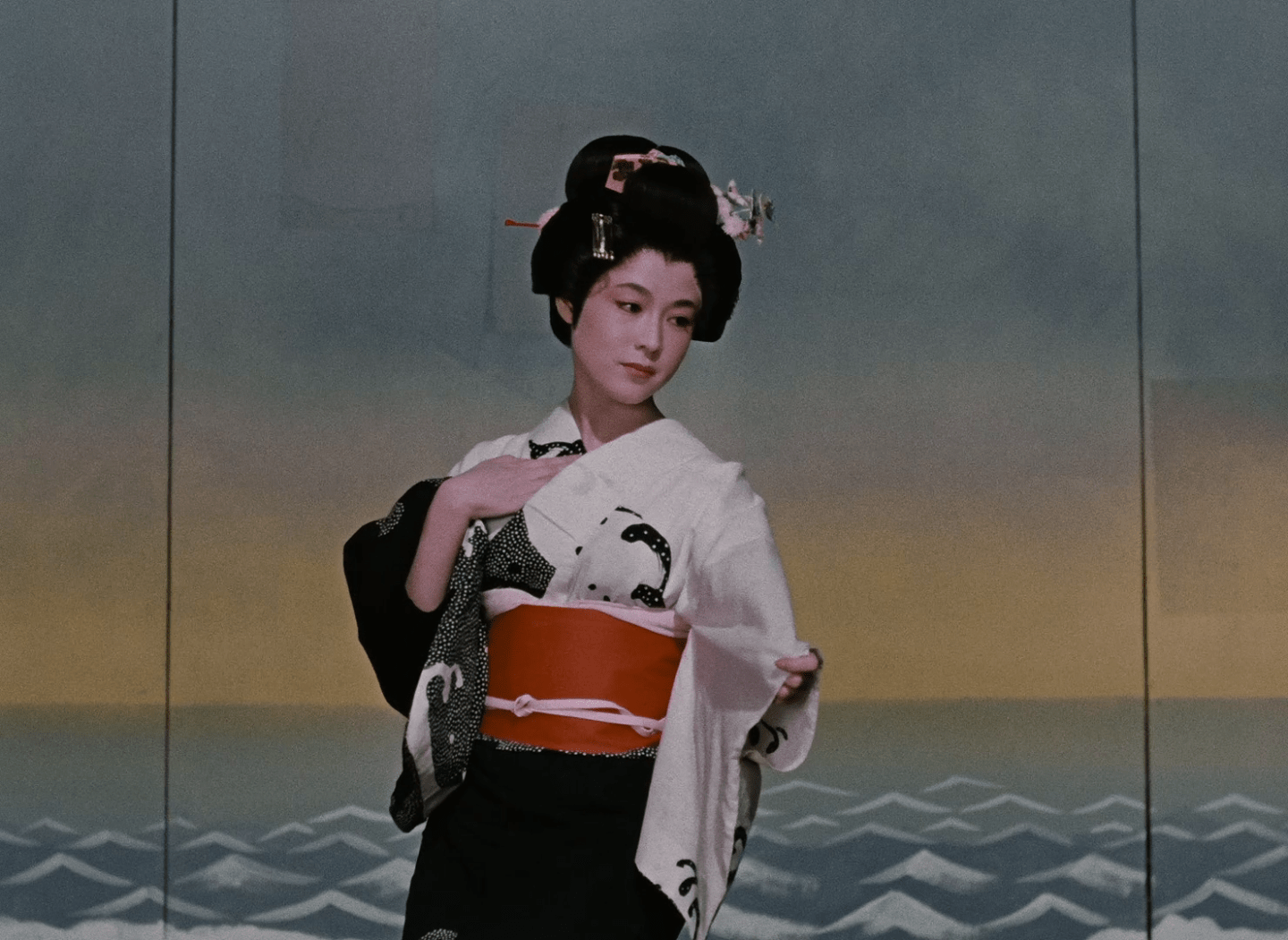 This slight disconnect, along with Gajiro Nakamura’s cheekily comical performance, adds to the genial comedy which characterised the majority of Ozu’s colour films though this one is admittedly slightly less colourful owing to being produced by Daiei as one of a handful of films made outside Ozu’s home studio of Shochiku. Komajuro becomes a tragicomic rather than purely tragic figure, a man suddenly realising he has become old and facing the decline of his patriarchal authority. Like Kihachi he turns violence on both his mistress, Sumiko (Machiko Kyo), and the young actress Kayo (Ayako Wakao) who has fallen for his son, but it’s futile and born of desperation. A more sympathetic figure than 1934’s Otaka, Sumiko seems to genuinely like Komajuro and is hurt as well as jealous and threatened by the existence of his “secret” family. Her petty revenge is taken in response to Komajuro’s bitter claim that his son “belongs to a higher race” moments after bringing up her past as a sex worker. Rather than a simple desire for chaos and upset, she intends to pull Kiyoshi down to her level through getting him to sleep with Kayo, but Kayo falls for him for real only to worry she is perhaps ruining his bright future.