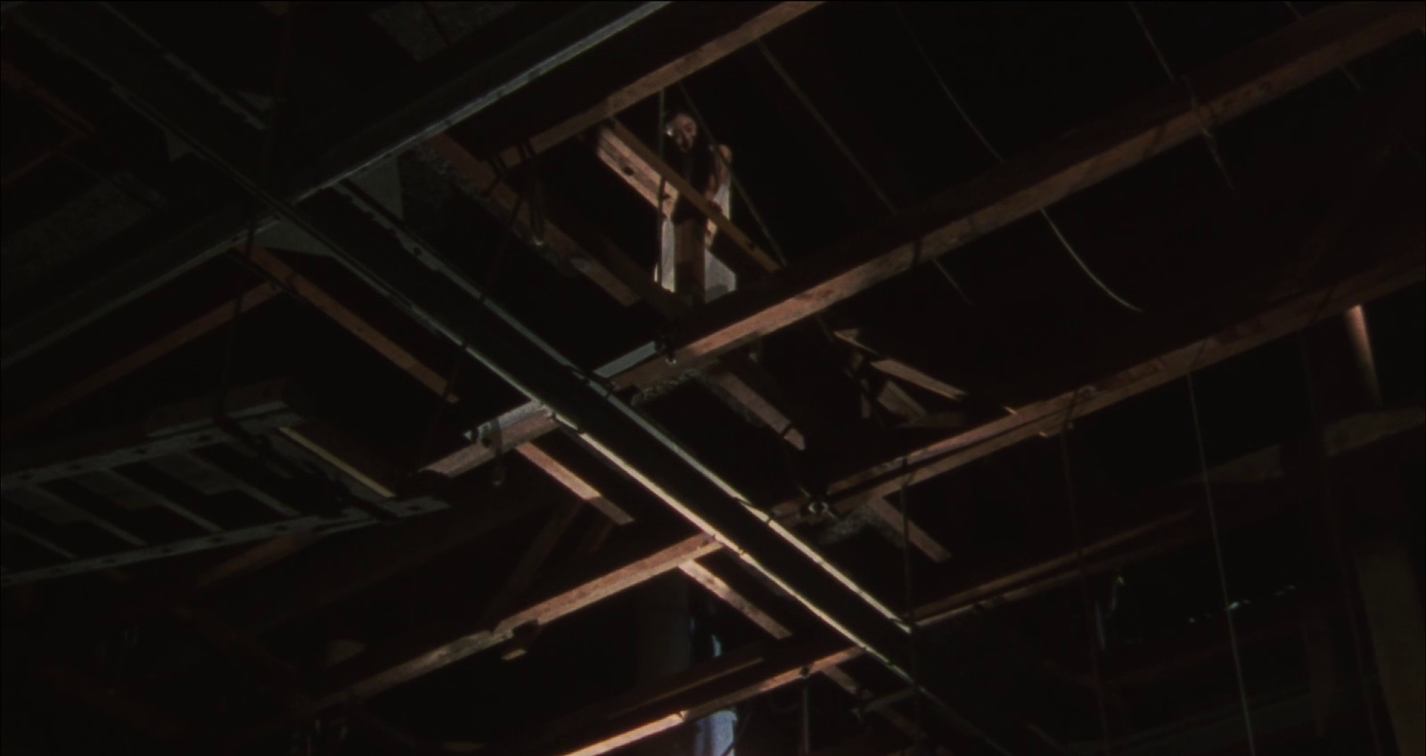 That’s one reason Muroi is advised not to look up and break this sense of allusion, along with recalling the more recent tragedy of an actress’ accidental fall. As much as Hitomi and Saori (Kei Ishibashi) begin to overlap with the image of the ghostly actress, it’s Muroi who is eventually swallowed by his dream of cinema in his determination to climb the stairs and find out what horrors are lurking in the attic before being dragged away to some other world. Nevertheless, this is a film that could only be made with celluloid. Nakata slips back and fore between the film that we’re watching and the cursed negative with its ghost images from previous exposure. This is evidently a low-budget production too, made using end cuts from other reels. As someone points out, this unused footage would usually be thrown out but has somehow mysteriously ended up infecting their film and releasing its ghosts. The projectionist burns it, describing the film as “evil” and suggesting that it’s better to let sleeping dogs lie.