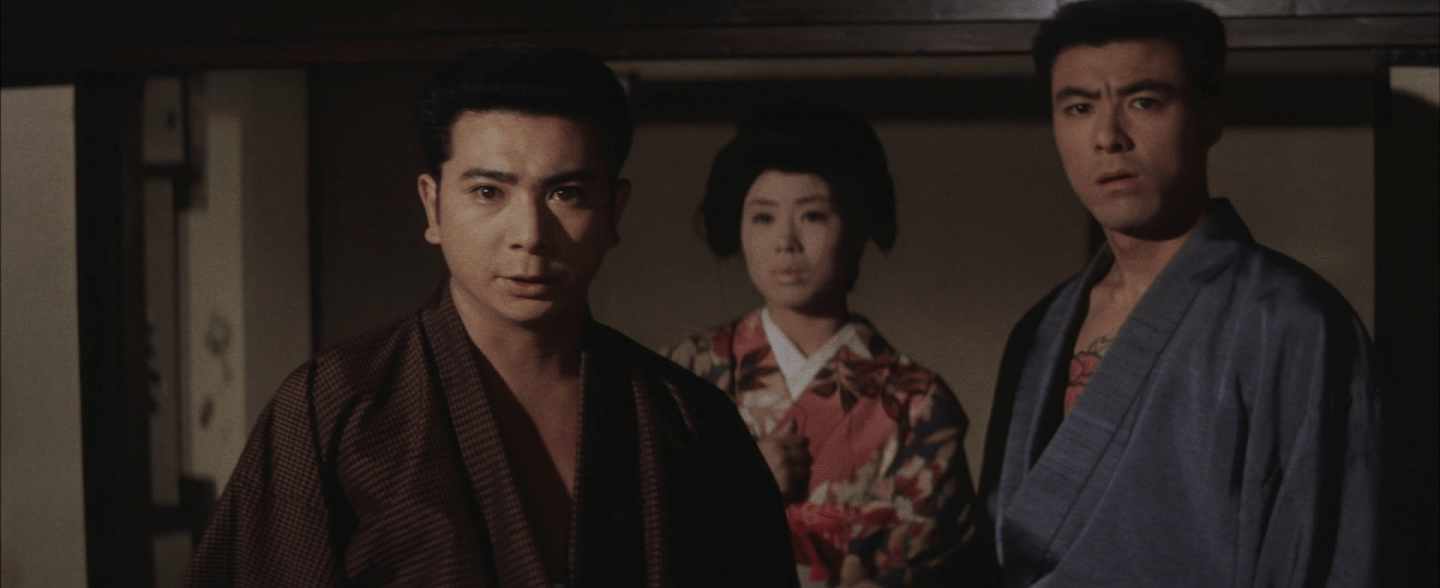 Asakichi is a small-town boy from rural Kawauchi. Despite the nobility which later comes to define his character, he’s disowned by his family after stealing a chicken from a yakuza-affiliated farmer to use in a cock fight. Originally, he skips town, with the farmer’s apparently married sister Kiyo who tells him that she’s pregnant though is probably not telling the truth. In any case, when they get to the next town he discovers she’s been engaging in sex work and breaks up with her, but Kiyo is only one element of his increasingly complicated love life. While staying in the town, Asakichi ends up developing a relationship with besotted former geisha Kotoito (Yaeko Mizutani) whom he eventually agrees to help rescue through another elopement. Meanwhile, he also becomes a “guest” of the local Yoshioka yakuza group and sworn brother of former enemy Sada.(Jiro Tamiya).