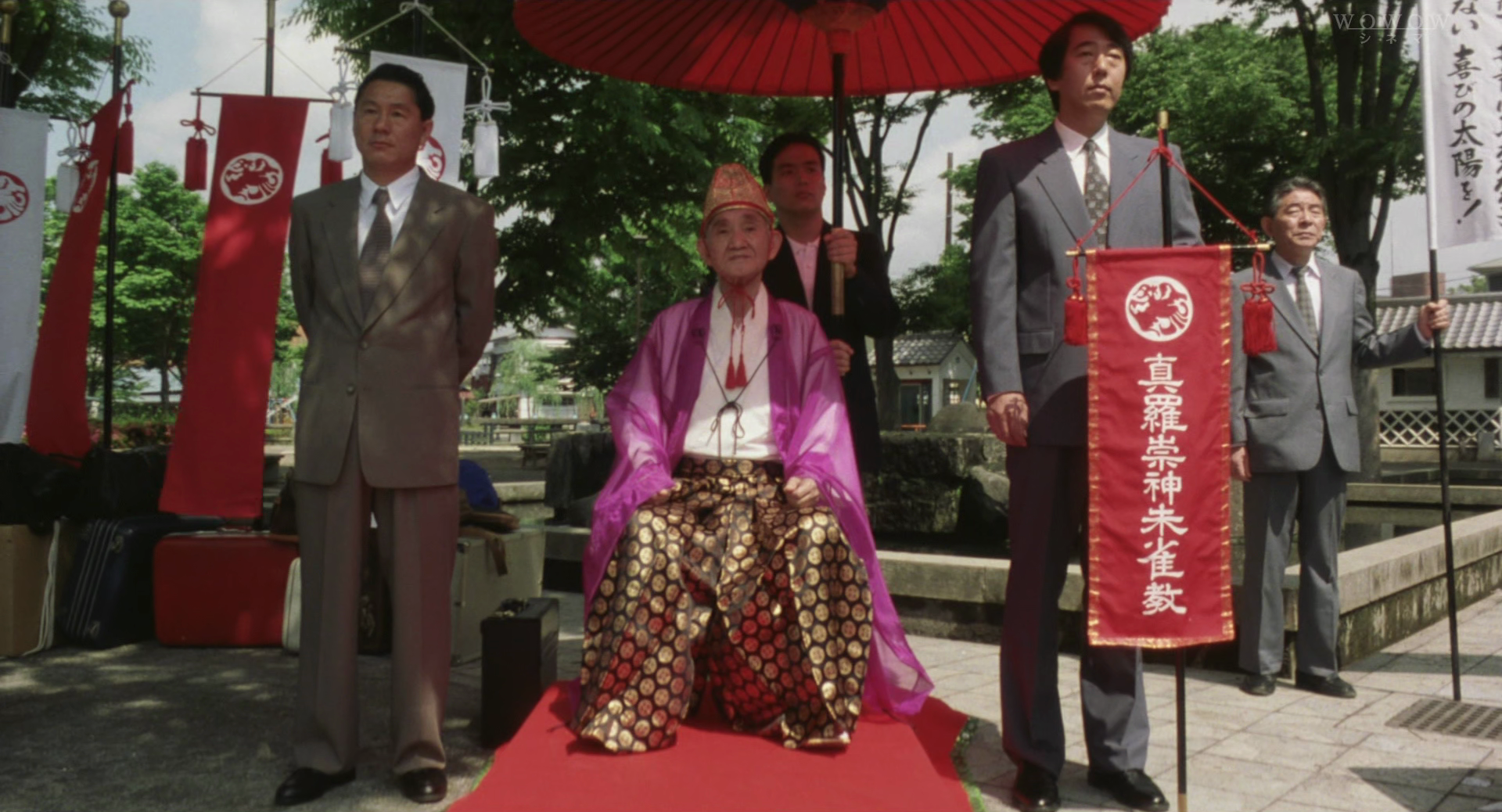 Kazuo (Masato Hagiwara), a wandering young man, asks himself why people join join cults while insisting that all looks so fake but later becomes fascinated with them himself. He can tell that the elderly woman who can suddenly walk again after an encounter with the leader (Masami Shimojo) is probably a plant, but is intrigued rather than outraged. Shiba (Takeshi Kitano), the actual “leader” of the group, tells him that it doesn’t matter. The leader healed the lady before at some point in the past, and they’re just reenacting it to show the power of god, which doesn’t really make sense, but it seems to satisfy Kazuo for the moment.
