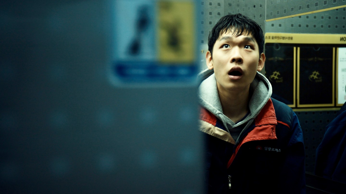 In any case, Min-joon is surrounded by radio broadcasts about North Korean missiles and various other disasters that lend an additional sense of doom to his monotonous life. Min-joon is honest and hard-working, diligently delivering parcels all day long and taking good care of his van, only to be treated with contempt and a constant stream of problems from his family. He dreams of becoming a film director, but is always frustrated, first by being unable to afford a colour print of his script and pitch for a producer he met through a connection. He shows up in a neat suit ready to discuss his idea, but she immediately shoots him down by saying that no one makes this kind of film any more and he has zero chance of directing anything. She advises working on the set to gain more experience, but those kinds of jobs don’t usually pay very well and Min-joon probably couldn’t afford to take it even if he weren’t hurt and demoralised by the humiliating experience of being so casually dismissed.