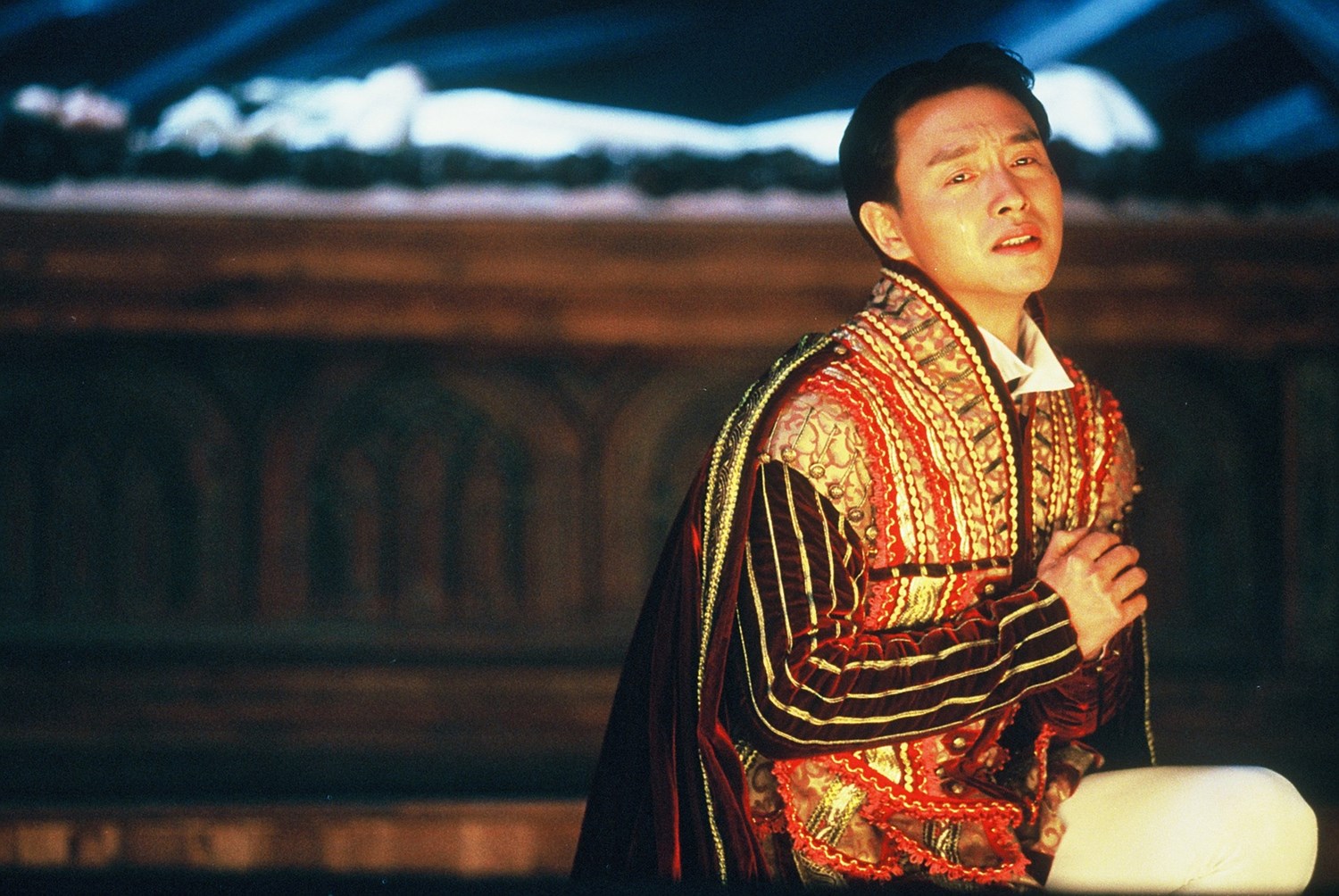 Counter-intuitively, Yu shoots the ‘30s sequence in a washed-out sepia with occasional flashes of colour almost like hand-tinted photographs. As Ma spins his story, we transition into a sumptuous world of reds and golds in the old opera house designed, as we’re told, by the famous actor Song Danping (Leslie Cheung Kwok-Wing) who is said to have perished along with it in the fire. Danping, to whom Wei Qing is constantly likened, was the greatest actor of the age famous for his performances in Western theatre, such as the Mandarin musical adaptation of Romeo and Juliet in which he was performing immediately before his death. In a case of life imitating art, Danping had fallen in love with the daughter of a wealthy family, Yuyan (Geng Xiao-Lin), and wished to marry her, but actors belong to an undesirable underclass and in any case, Yuyan’s father had already arranged her marriage to the idiot son of a powerful politician, Zhao (Bao Fang), in exchange for smoothing the path for his new factory enterprise.