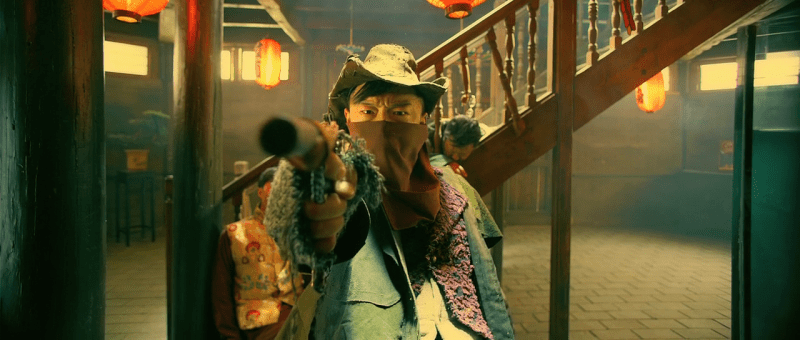 The final title card dedicates the film to “the movies we loved when we were young,” and Guan certainly does make good use of silent film aesthetics, even in also falling into a more mainstream sensibility and employing may of the same mannerisms as similar blockbuster movies with split screens and fast zooms. The film’s zany humour plays out almost as a kind of reaction to the grim and absurd world all around it in which death lurks all around, along with Japanese Imperial forces and bandits, and nothing is quite as it first seems to be. The Japanese soldiers refer to the Chinese as “Shinajin,” a sort of derogatory term meaning “Chinaman,” while the trio refer to the Japanese as “kimonos” as if to signal their mutual animosity while the dialogue itself is full of silly puns and weird swearing.