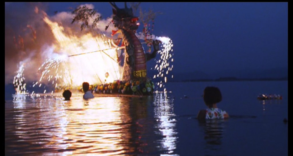 The fire festival is “for men”, according to Tatsuo, “to drive out evil spirits”, his manliness getting the better of him as he disrupts the proceedings to attack a man he accuses of having brought “false fire”. These are the lessons he teaches to surrogate son Ryota whose devotion to him borders on the homoerotic, Tatsuo cradling him during the climactic rain storm and he seeming to develop a fascination for Kimiko as a kind of indirect fixation. Ryota has learned Tatsuo’s chauvinism mimicking his lewd hand gestures and swaggering walk, his cruelty in sacrificing 1000 yen to trick Yamakawa into injuring his hand in a bear trap, and his arrogance ensuring that his problematic masculinity will survive into another generation presumably no more capable of halting the march of modernity than he has been. Tatsuo poisons the waters with fuel oil which as one of the greek chorus of fish wives points out does not catch fire, Tatsuo himself smouldering until an inevitable explosion. Receiving some kind of epiphany during a mystical congress with the goddess in the middle of a storm, he knows what he must do and accepts that he cannot progress into the modern society. Smoulderingly intense in its small-town animosity and primeval sensibilities, Yanagimachi’s poetic tragedy of futility and the broken promises of a badly distributed modernity may accept the the sacrifice but mourns it all the same.