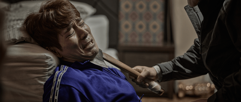 The backstory goes someway to giving Min-cheol justification for his complicity while it’s clear he disapproves and is not directly violating these women for his own gratification or direct financial gain. He does not, however, do all that much to resist beyond telling gangster Deuk-cheol that he won’t participate any further. It’s clear that environment around him is extremely misogynistic, and the anxiety enveloping Eun-soo all too real as a previous spy cam victim now left paranoid, checking all around her for anything that looks out of place. A sign outside a bathroom at a petrol station states that it’s a “safe” space because they regularly sweep for cams which somehow doesn’t seem very reassuring. In any case, the attendant is busy watching videos of girls dancing on Tiktok while another guest at the love hotel badgers Min-cheol to call him a “coffee girl”. The killer himself is also an embodiment of this pervasive misogyny, silently stalking his prey and slashing anyone who gets in his way.