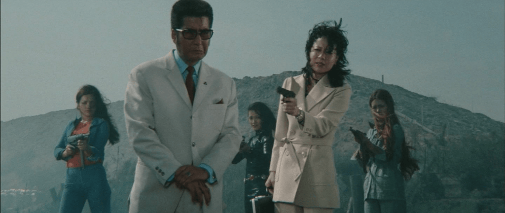 Meanwhile, as a kind of counter to Rumi, Hisako, and Yasuda’s girlfriend, Kumasa’s woman Beniko (Kimiko Yo) who is very much involved in policy decisions and actively fights back in defence of Kumasa who is otherwise a bit useless. The film is sleazy from its opening rape sequence to the soapland escapade and inexplicable closing credits which consist of a number of raunchy gravure shots backed by a power ballad that otherwise have little to do with the rest of the film, but is perhaps less cynical that it appears or at least seems to edge away from nihilism towards something that appreciates that a more emotional, poetic kind of justice is possible and valid. Takanashi is allowed to complete his quest, though it incurs additional casualties, and then leave the scene having achieved a kind of closure and brought the cycle to an end leaving the rest to Nakatsuka and Uchino who now seems to have crossed over to Nakatsuka’s side if perhaps lamenting that he may be working far too hard to a achieve a justice that now seems surprisingly easy to enact.