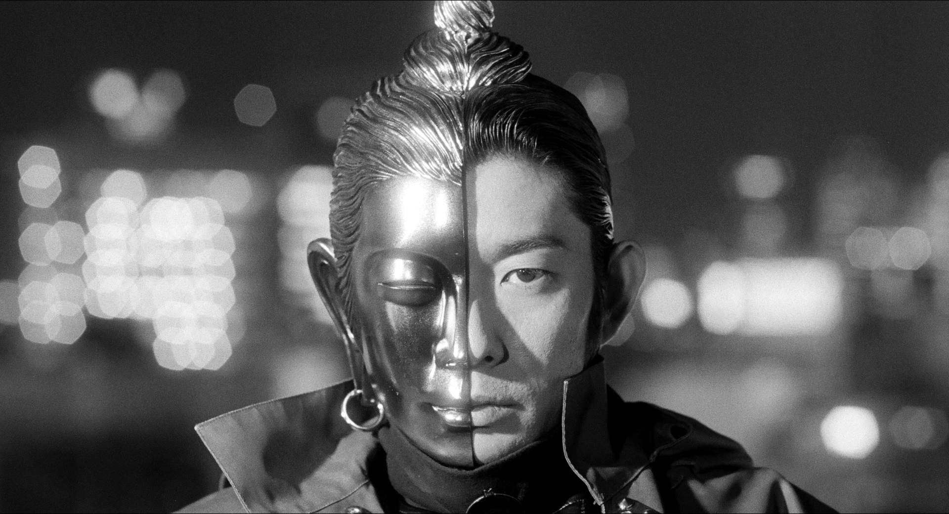 Meanwhile, Thunderbolt Buddha (Masatoshi Nagase) is literally divided in two, one half of his face covered in a metallic Buddha mask hinting at the inner duality which at times literally leaves him at war with himself while wandering around with an electric metre trying to control not just his own flow but everyone’s. “He’s the electricity man! All its wavelengths are his!” the narrator explains, while Thunderbolt Buddha turns his head to the Buddha side and an old lady prays to him in his infinite calmness. Not so long before, he’d been acting as a vigilante thief, like Dragon Eye in the ring only darkly exorcising his frustration through violence attacking the corrupting forces of the contemporary society. Perhaps jealous, or just seeking an escape, Thunderbolt Buddha gradually dismantles all of Dragon’s Eye’s means of self-regulation, disappearing lizards and chopping his electric guitar into a series of uniform triangles. Dragon Eye tries to put it back together, but the guitar doesn’t play the right tune anymore, now echoing Thunderbolt Buddha’s eerie discordance. “I just wanted to see you angry” Thunderbolt Buddha admits, trying to engineer a battle that will decide each of their fates.
